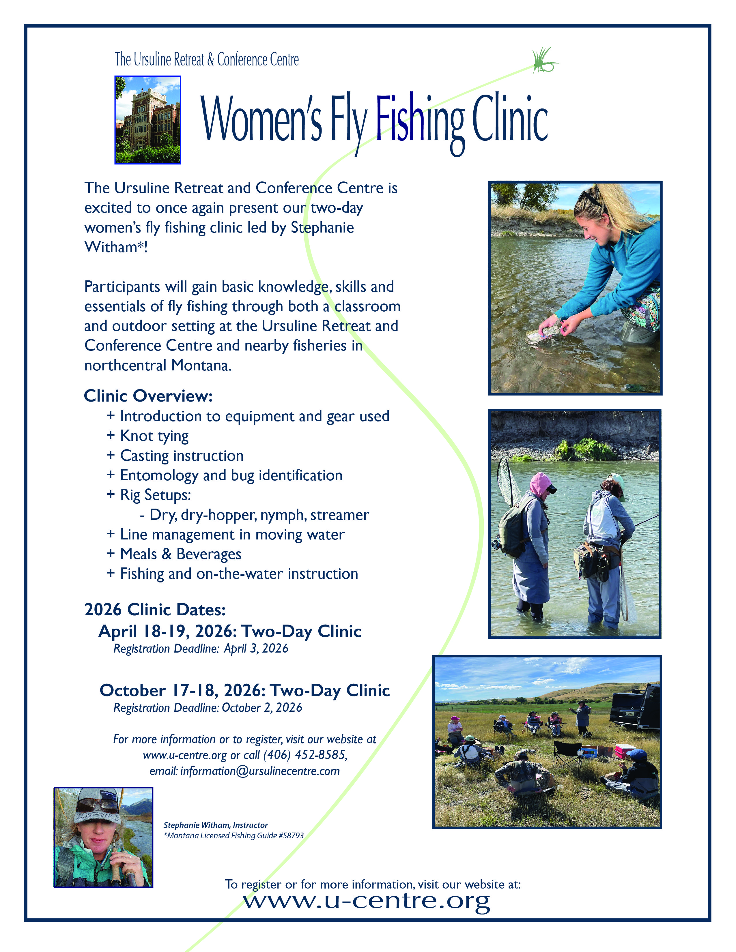 The Ursuline Retreat and Conference Centre is excited to once again present our two-day women's fly fishing clinic led by *Stephanie Witham! Participants will gain basic knowledge, skills, and essentials of fly fishing through both a classroom and outdoor setting at the Ursuline Retreat and Conference Center and nearby fisheries in northcentral Montana.